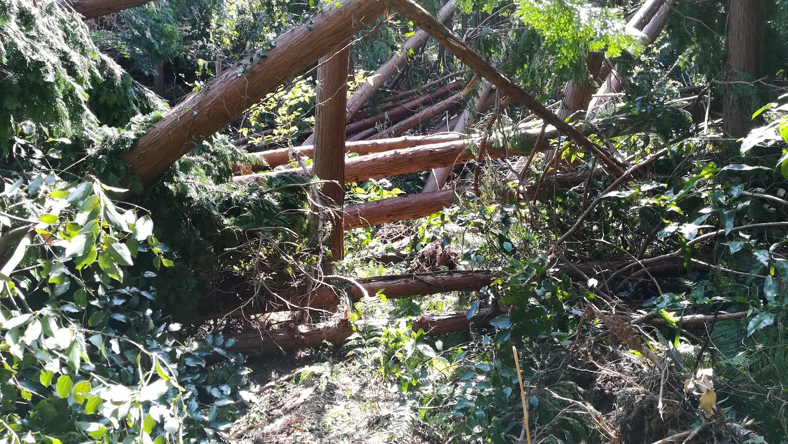 最もひどい個所では大木が幾重にも重なって倒れており、トレイルを完全に潰してしまっています。これはもう個人の作業ではどうにもならないレベル。林業のプロが重機を含む大掛かりな器具を使わないと除去できそうにありません。
